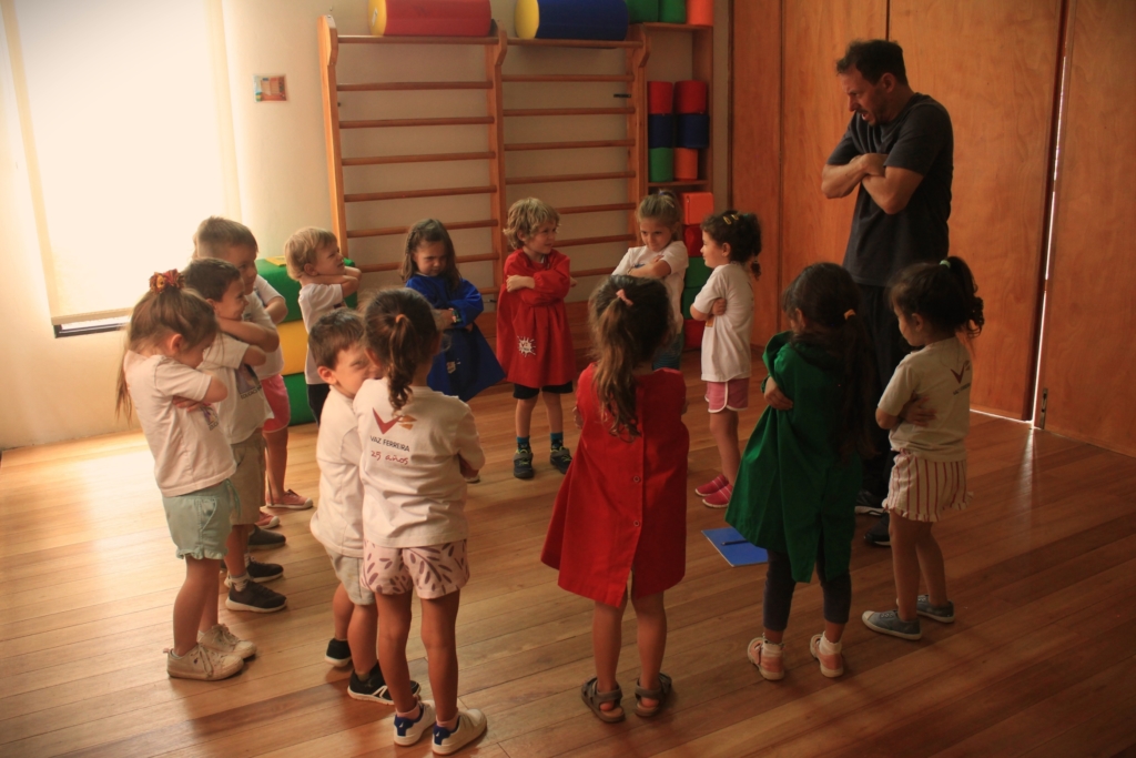 La alegría y el disfrute es lo que caracteriza todas las actividades: desplazarse en distintas direcciones y con distintos ritmos, pasar por puentes, túneles, hacer volteretas, saltar en el colchón, usar cuerdas, globos, aros, pelotas, bolsas de arena, en una palabra jugar, jugar y jugar… jugar con su cuerpo, con los materiales y con otros niños, venciendo pequeños y grandes desafíos.